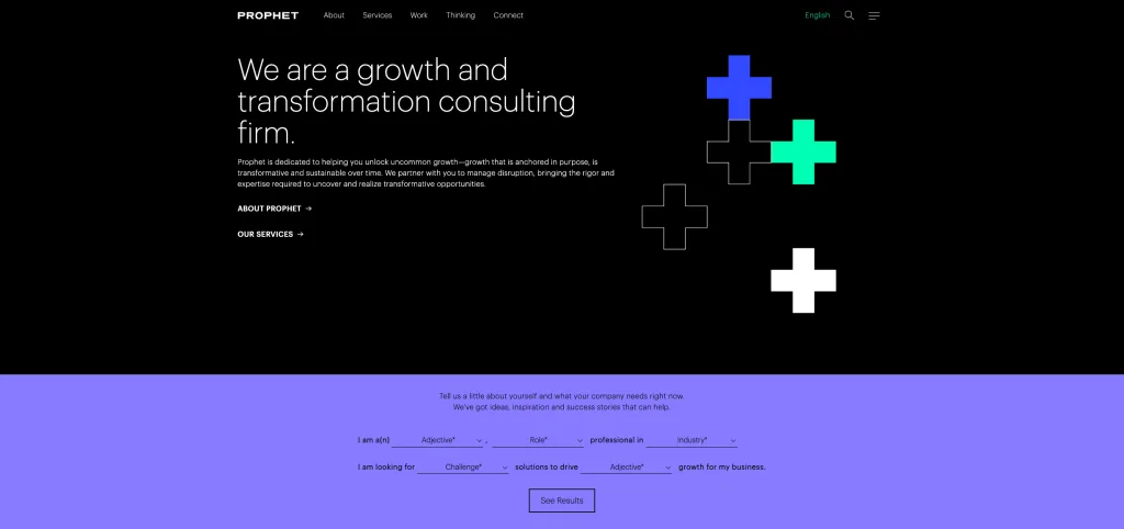 Last but not least on list list is Prophet. What I love about this site is the use of strong fonts, messaging, branding and simple layouts. Their website offers a clean, professional design and focuses on helping businesses achieve sustainable growth. The site features various services, case studies, and thought leadership articles, providing comprehensive insights into their approach and expertise. It’s designed to cater to diverse industries, highlighting their commitment to innovative solutions and client success.
