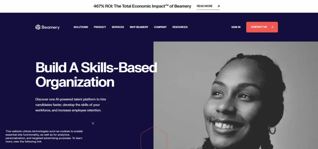 Beamery’s website impresses with a sleek, contemporary design that reflects its focus on talent acquisition and management solutions. The use of bold colors, primarily purple and white, creates a vibrant and engaging user interface. Unique aspects include interactive graphics and concise, informative content that efficiently communicates their services’ value. The layout is user-friendly, with clear navigation that facilitates easy access to product information, company insights, and industry resources. This design approach effectively combines aesthetic appeal with functional clarity, making it an exemplary platform for professional development and corporate training design ideas.