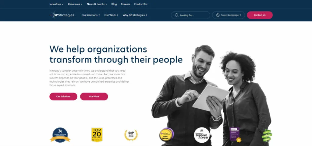 This website impresses. With its straightforward and user-friendly design, GP Strategies has a great balance between using black and white with color in a super intelligible way. The clean layout and intuitive navigation make it easy for visitors to find what they’re looking for, whether it’s information on their diverse range of training and development services or insights into their industry expertise. The site’s use of real-world examples in their content helps to illustrate their impact and effectiveness in a relatable way. This approachable and practical style makes the website appealing to a broad audience.