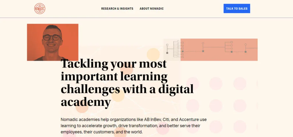 Nomadic Learning’s website offers a modern and interactive experience, emphasizing their digital academy approach to enterprise learning. The site’s design is clean and user-friendly, showcasing their expertise in creating collaborative and impactful learning experiences. It effectively highlights their unique methodology, emphasizing group interaction and skill development for today’s work environment, backed by impressive engagement statistics.