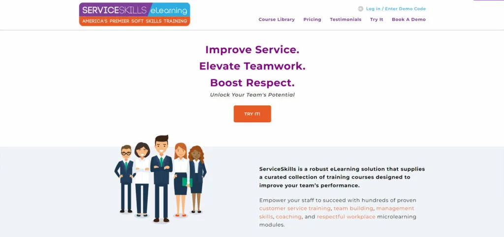 ServiceSkills.com offers an engaging and informative platform focused on eLearning solutions for customer service training. The website is well-organized, facilitating easy navigation through its comprehensive course library. It combines a professional design with interactive elements, effectively showcasing a wide range of training modules designed to enhance communication skills and improve job performance in various workplace scenarios.